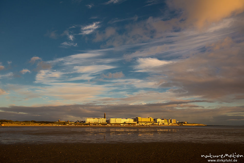 Abendstimmung Strandpromenade und Fassaden der alten Hotels, Hohes Riff, Borkum, Deutschland