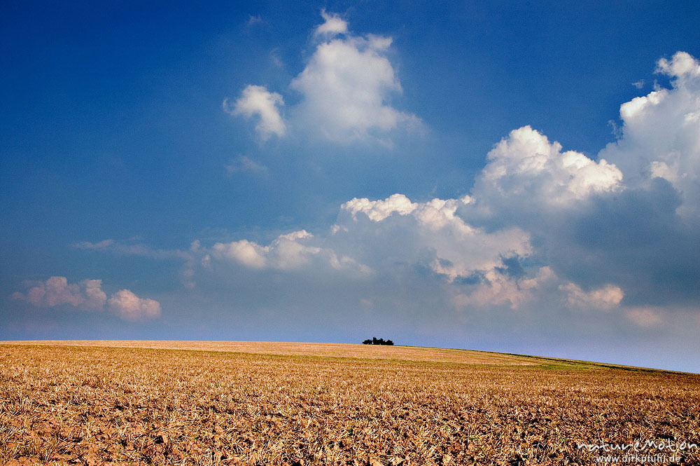 abgeernteter Acker, Hügelkuppe mit Busch, Wolken Göttingen, Deutschland