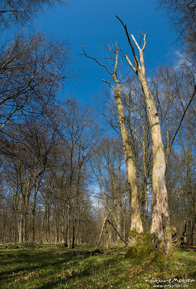 abgestorbene Bäume in lichtem Frühlingswald, Settmarshausen bei Göttingen, Deutschland