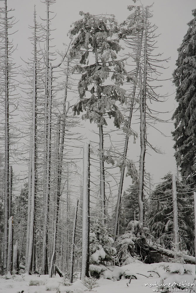abgestorbene Fichten, vereist, bei Torfhaus, Harz, Deutschland