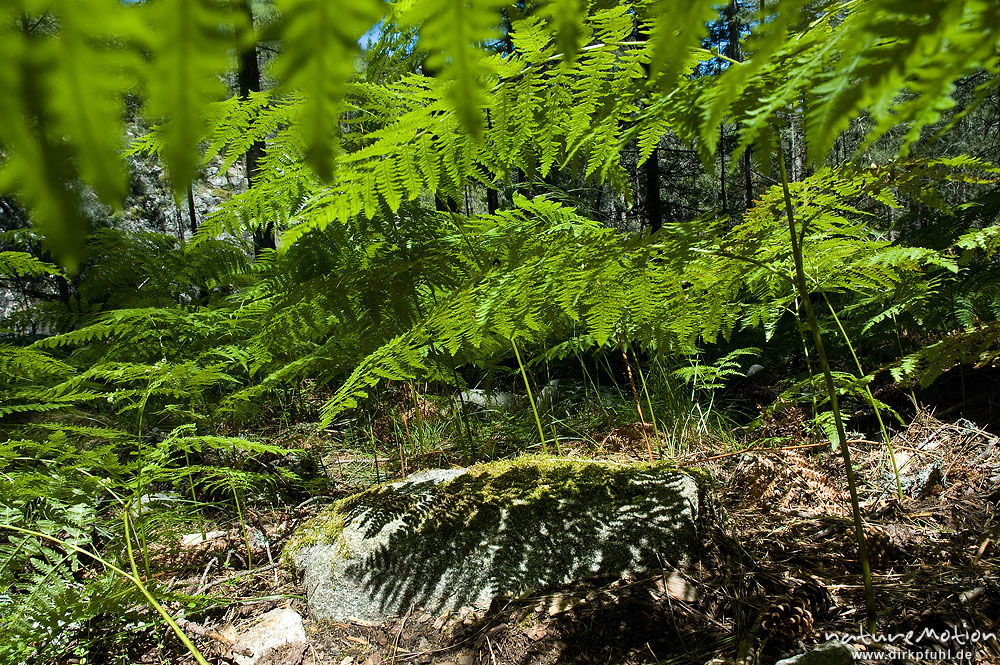 Adlerfarn, Pteridium aquilinum, Hypolepidaceae, lichtdurchfluteter Bestand, Felsen, Schatten, Manganello-Tal, Korsika, Frankreich