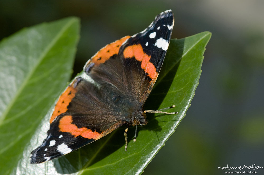 Admiral, Vanessa atalanta, Nymphalidae, auf Fliederblatt, Am Weißen Steine 24 Göttingen, Deutschland