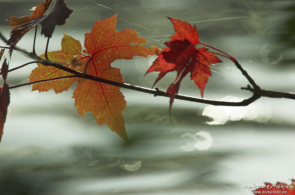 Ahorn, Blätter mit Herbstfärbung, im Hintergrund Wasseroberfläche, Kiessee Göttingen, Deutschland