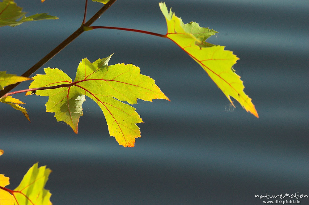 Ahorn, Blätter mit Herbstfärbung, im Hintergrund Wasseroberfläche, Kiessee Göttingen, Deutschland