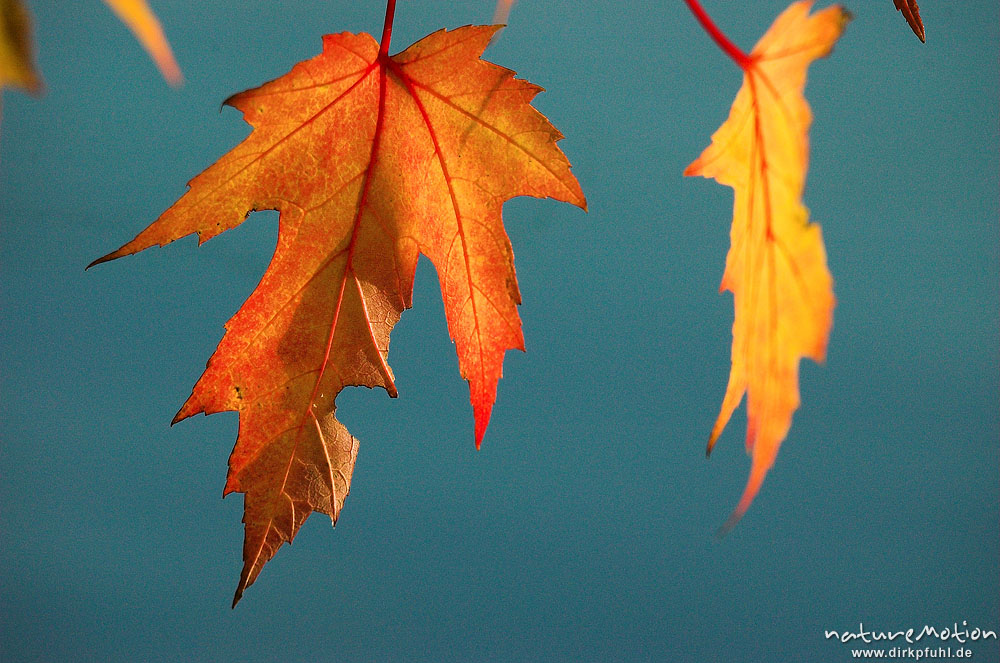 Ahorn, Blätter mit Herbstfärbung, im Hintergrund Wasseroberfläche, Kiessee, Göttingen, Deutschland
