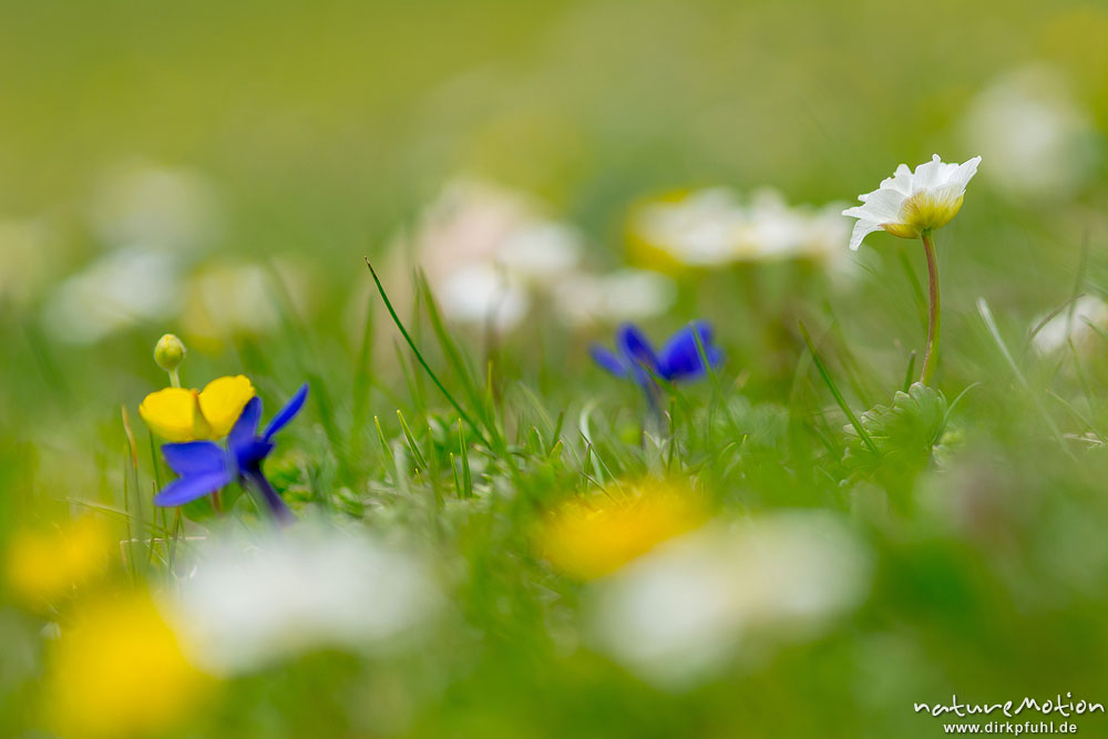 Almwiese mit Fr?hlingsenzian und anderen Arten, Touristensteig unterhalb Schlernhaus, Seiseralm (S?dtirol), Italien