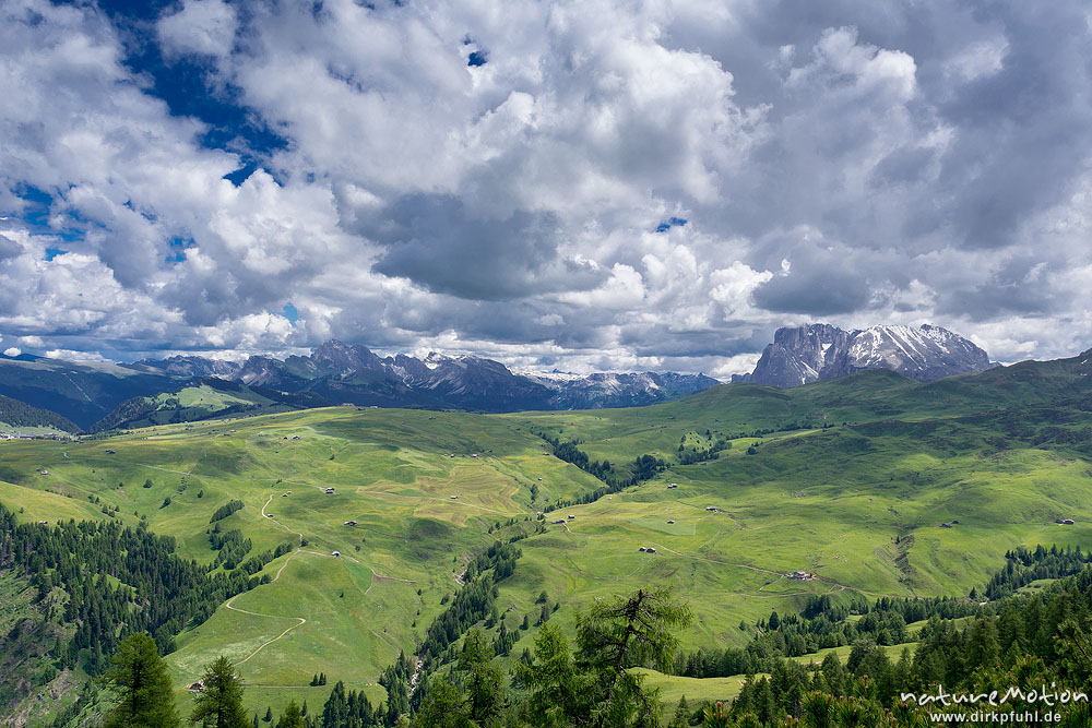 Almwiesen mit H?tten, Seiseralm, Geissler-Gruppe, Langkofel, Plattkofel, Seiseralm (S?dtirol), Italien