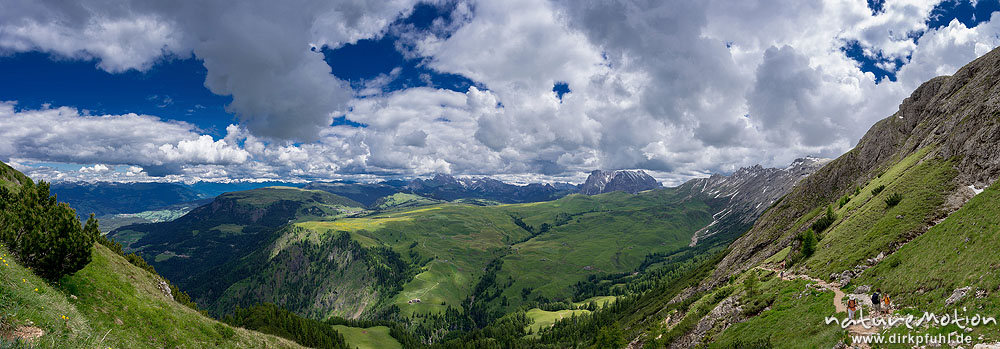 Almwiesen mit Hütten, Seiseralm, Geissler-Gruppe, Langkofel, Plattkofel, Wanderweg zm Schlernhaus, Seiseralm (Südtirol), Italien