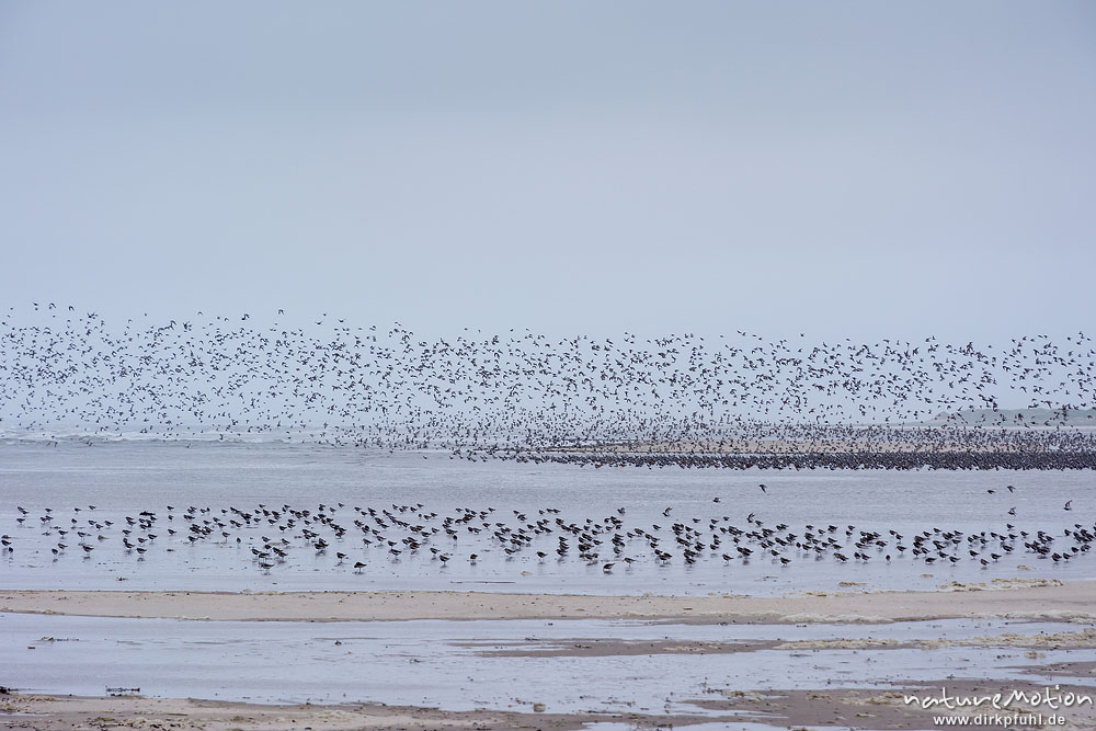 Alpenstrandläufer, Calidris alpina, Scolopacidae, Schwarm und am Strand rastende Tiere, Spiekeroog, Deutschland