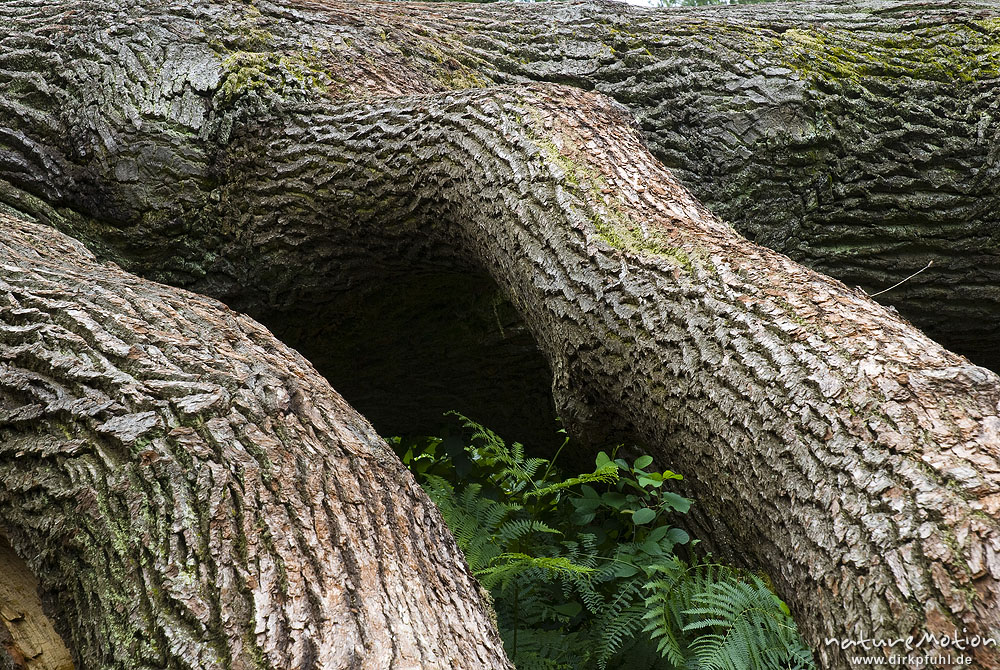 alte Eiche, Äste mit gut ausgeprägter Borke, umgestürzter Stamm, Urwald Sababurg, Deutschland