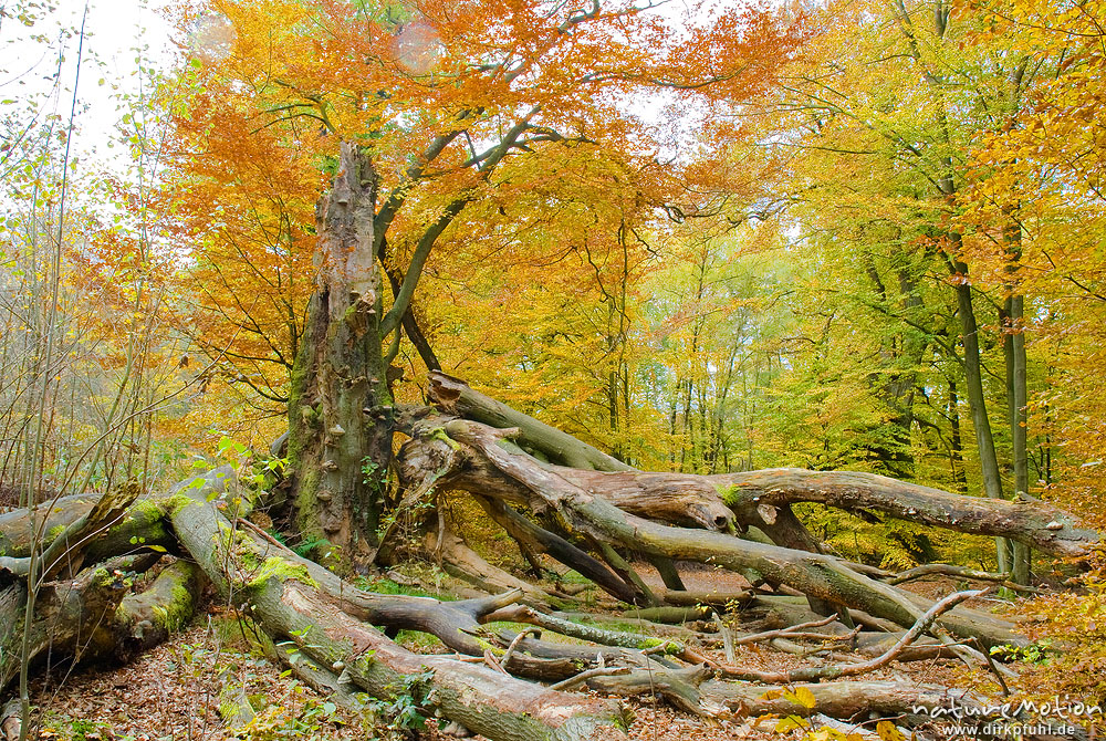 alte Eiche, ehemals einzeln stehend, jetzt inmitten von Buchenwald, herabgebrochene Äste, Adlerfarn, Urwald Sababurg, Deutschland
