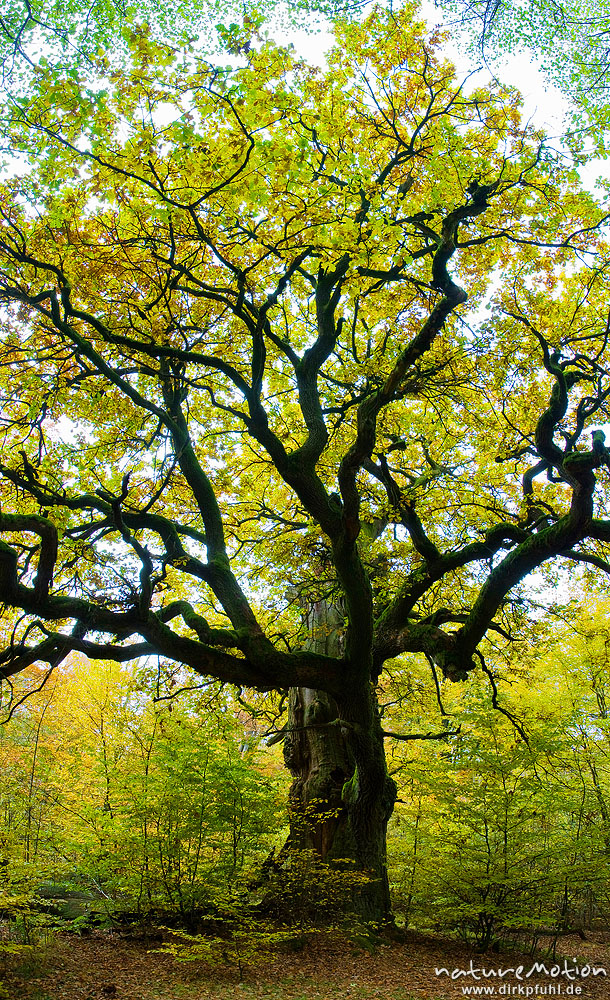 alte Eiche, ehemals einzeln stehend, jetzt inmitten von Buchenwald, Urwald Sababurg, Deutschland