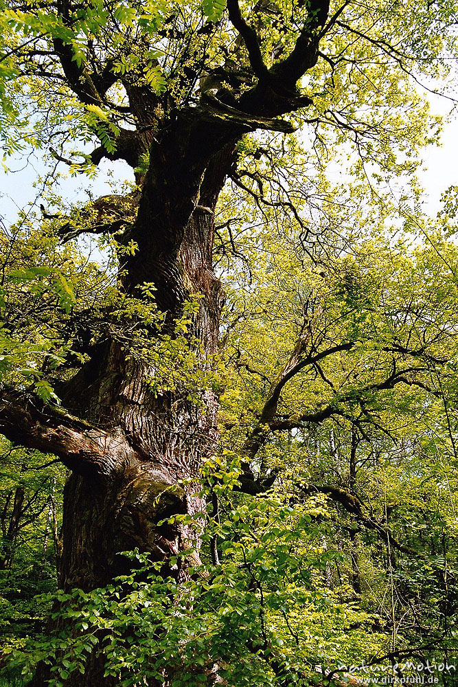 alte Eiche zwischen belaubten Zweigen Urwald Sababurg, Deutschland