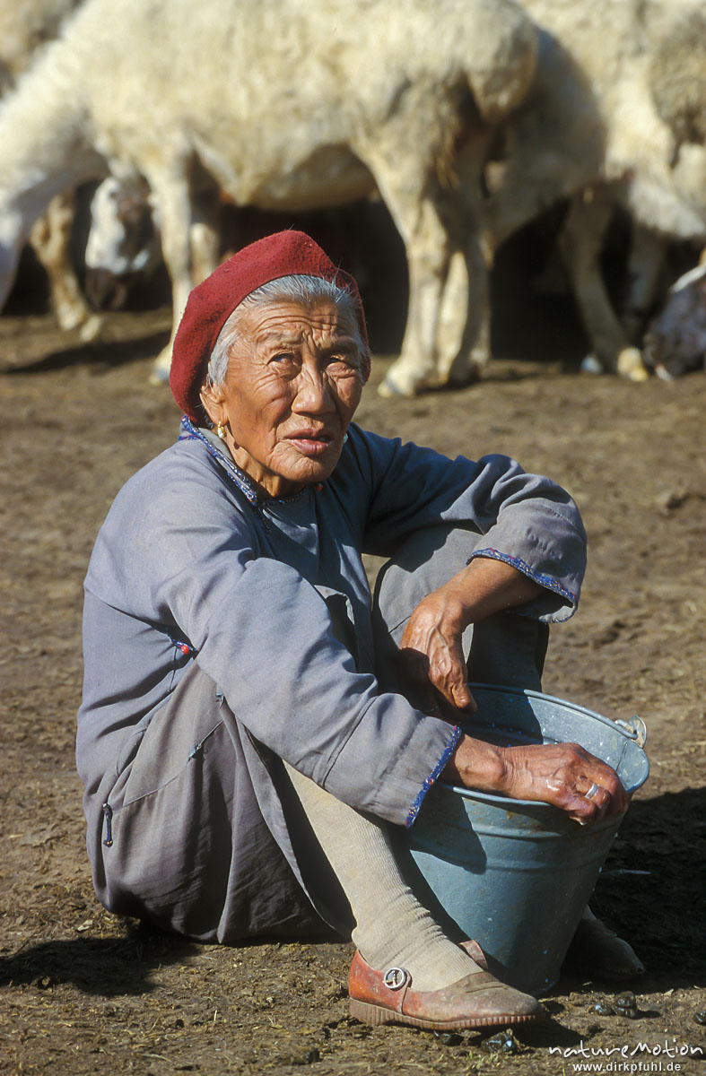 alte Frau mit Melkeimer, am Boden sitzend, Changai, Mongolei