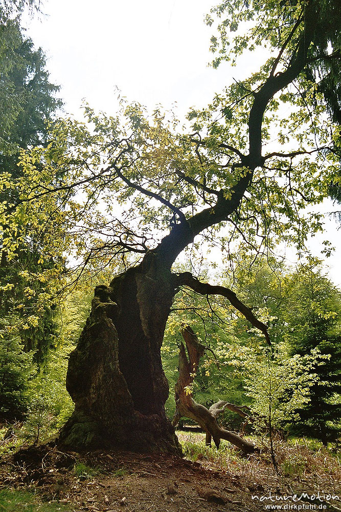 alte hohle Buche mit belaubten Zweigen Urwald Sababurg, Deutschland