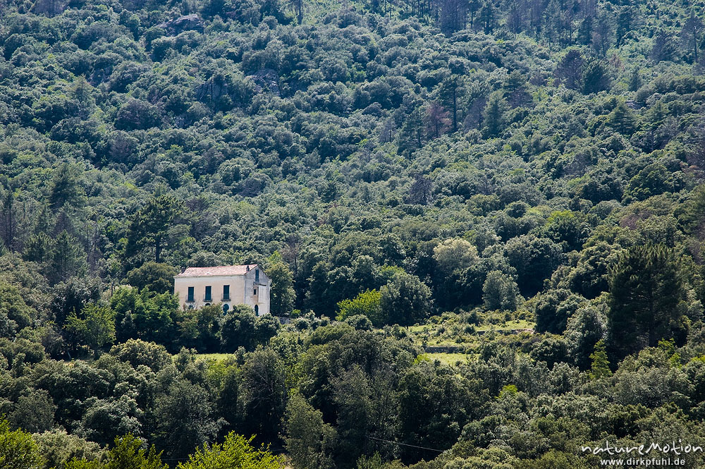 altes Gutshaus am Berghang zwischen Bäumen, Terrassen und zugewucherte Felder, Tavignano-Tal bei Cor, Korsika, Frankreich