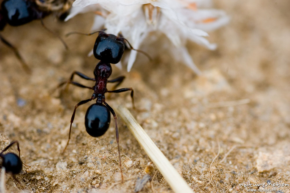 Ameisenbau, Eingang, Arbeiterinnen transportieren Blüten, Bodri Korsika, Frankreich