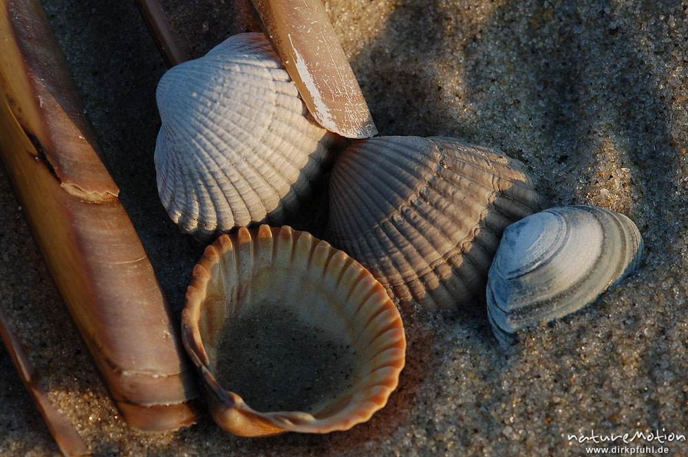 Amerikanische Schwertmuschel, Ensis ensis, Pharidae, Gewöhnliche Herzmuschel, Cerastoderma edule, Cardiidae, Schale im Sand, Rippenstruktur, Amrum, Amrum, Deutschland
