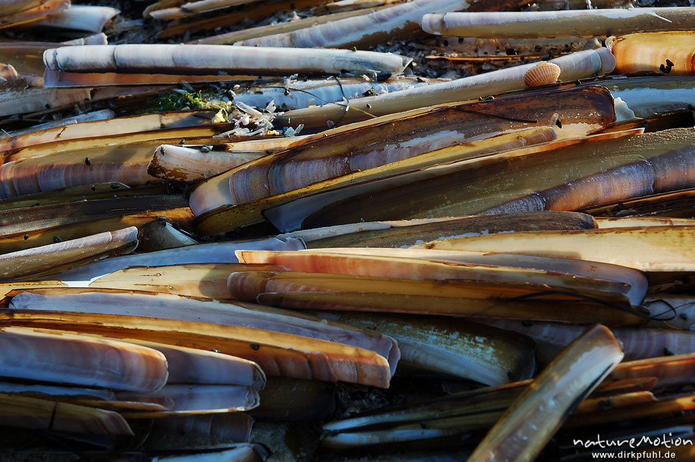 Amerikanische Schwertmuschel, Ensis ensis, Pharidae, Schalen im Sand, von den Wellen an der Flutlinie zusammengetragen, Amrum, Amrum, Deutschland