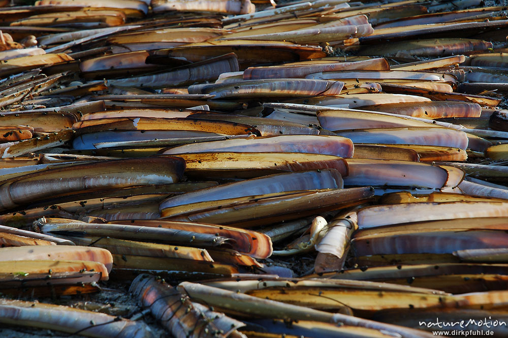 Amerikanische Schwertmuschel, Ensis ensis, Pharidae, Schalen im Sand, von den Wellen an der Flutlinie zusammengetragen, Amrum, Amrum, Deutschland