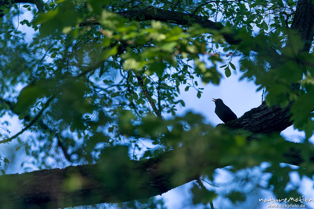 Amsel, Schwarzdrossel, Turdus merula, Drosseln (Turdidae), Männchen singt im Geäst einer Weide, Levinscher Park, Göttingen, Deutschland