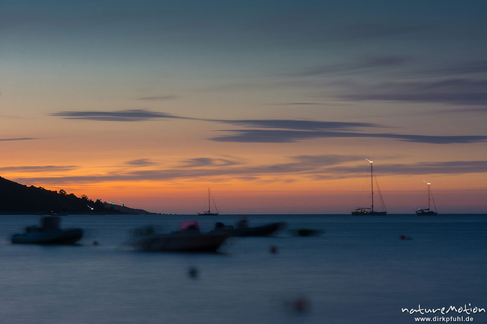 ankernde Segelboote im letzten Abendlicht, Bcuht von Saint Florent, Korsika, Frankreich