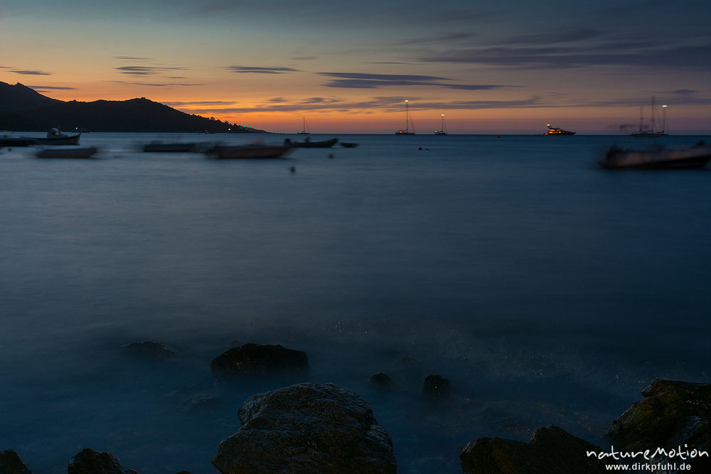 ankernde Segelboote im letzten Abendlicht, Bcuht von Saint Florent, Korsika, Frankreich