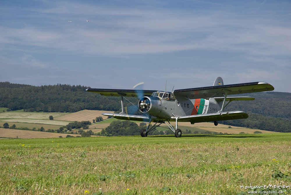 Antonow An-2 Doppeldecker Flugzeug, Start von Segelflugplatz, Flugtag Uslar, Uslar, Deutschland