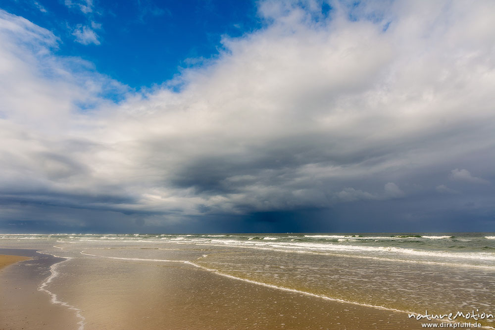 auflaufendes Wasser am Strand, Regenwolken, Spülsaum, Nordstrand, Borkum, Deutschland