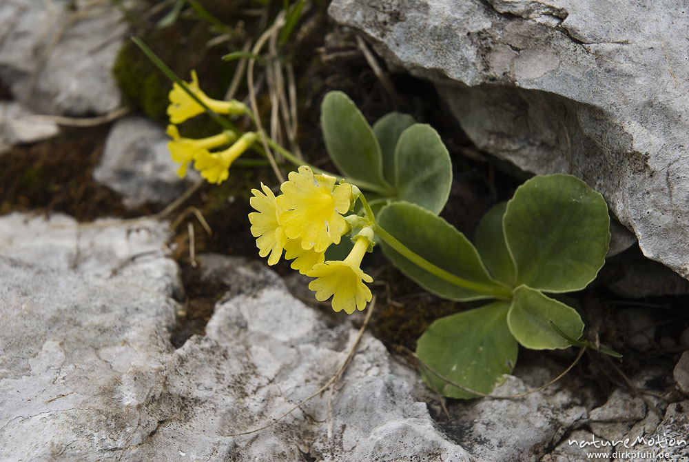 Aurikel, Primula auricula, Primelgewächse (Primulaceae), Felsspalte, Tal der sieben Seen, Triglav-Nationalpark, Slowenien