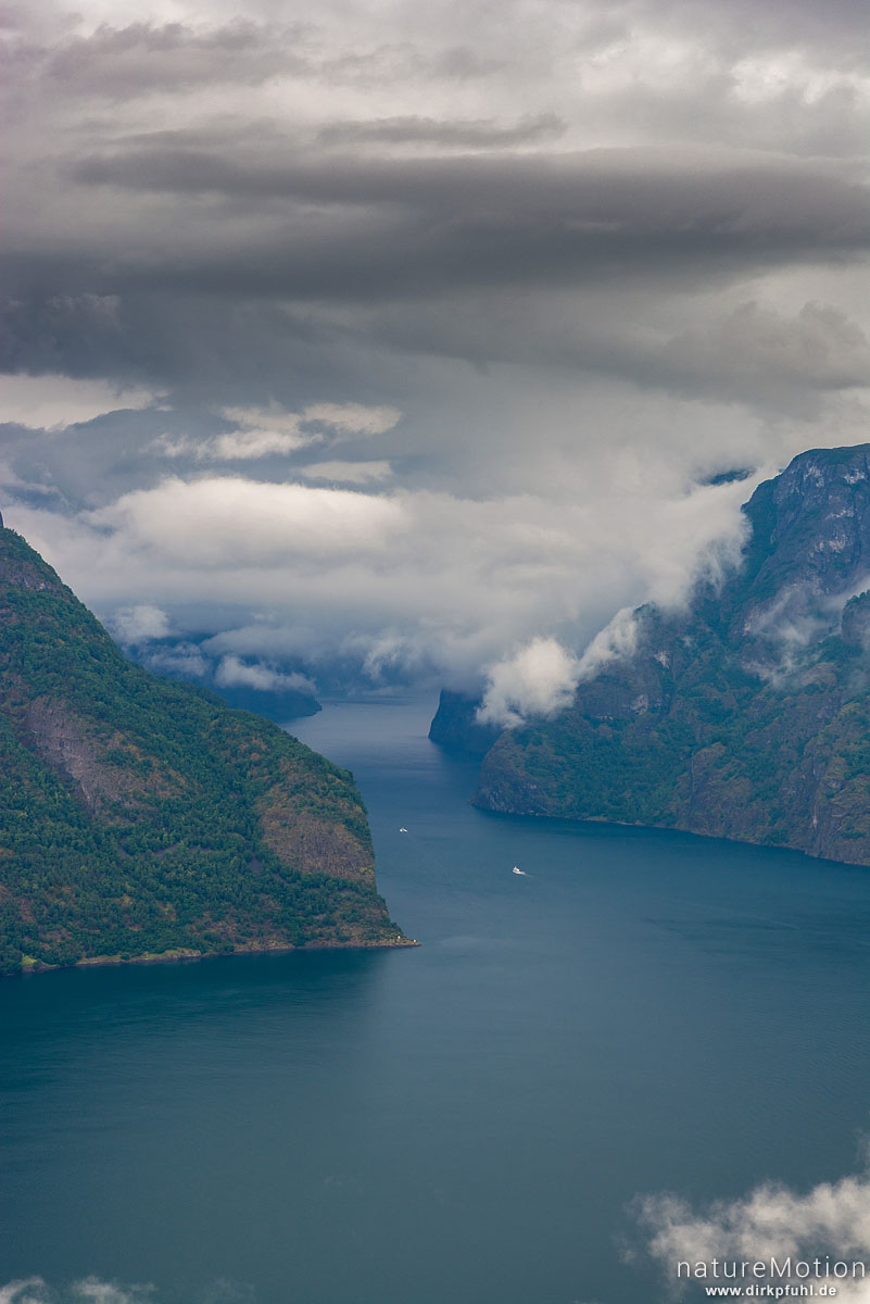 Aurlandsfjord mit durchziehenden Regenwolken, Aussichtspunkt Stegastein oberhalb von Aurland, Aurland, Norwegen
