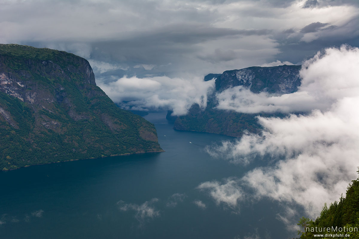 Aurlandsfjord mit durchziehenden Regenwolken, Aussichtspunkt Stegastein oberhalb von Aurland, Aurland, Norwegen