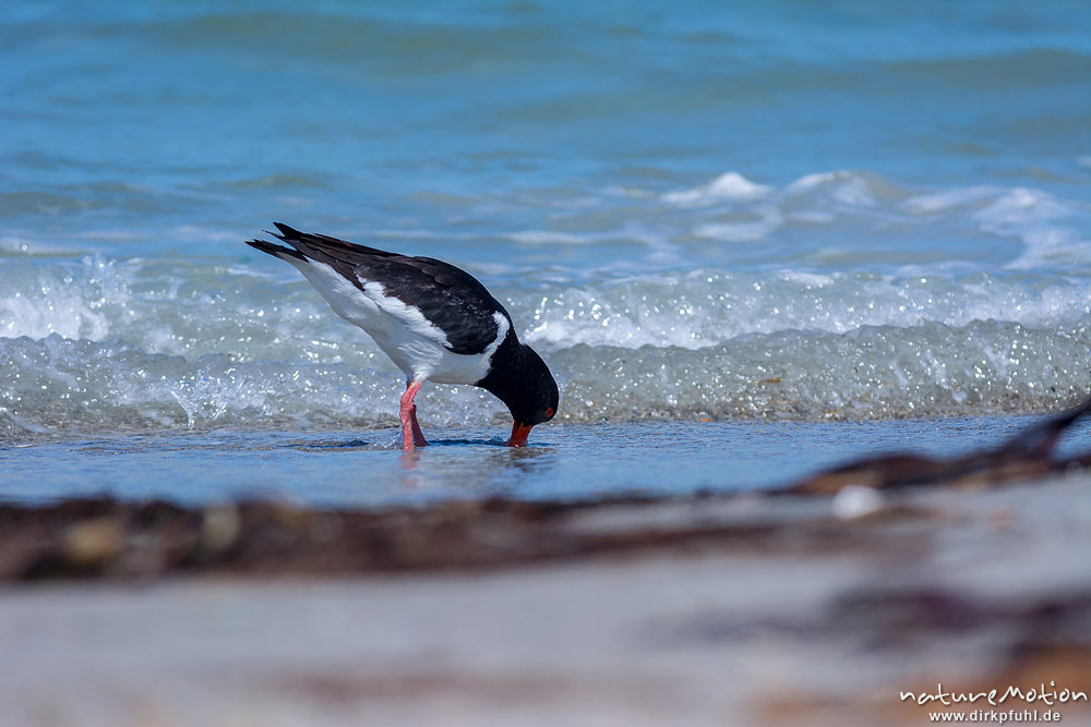 Austernfischer, Haematopus ostralegus, Haematopodidae, Tier läuft am Spülsaum und nimmt Bad in den Wellen, Düne, Nordstrand, Helgoland, Deutschland
