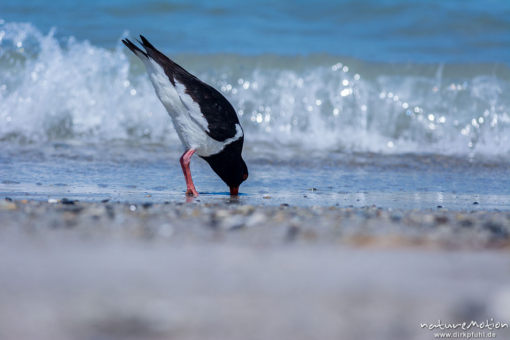 Austernfischer, Haematopus ostralegus, Haematopodidae, Tier läuft am Spülsaum und nimmt Bad in den Wellen, Düne, Nordstrand, Helgoland, Deutschland