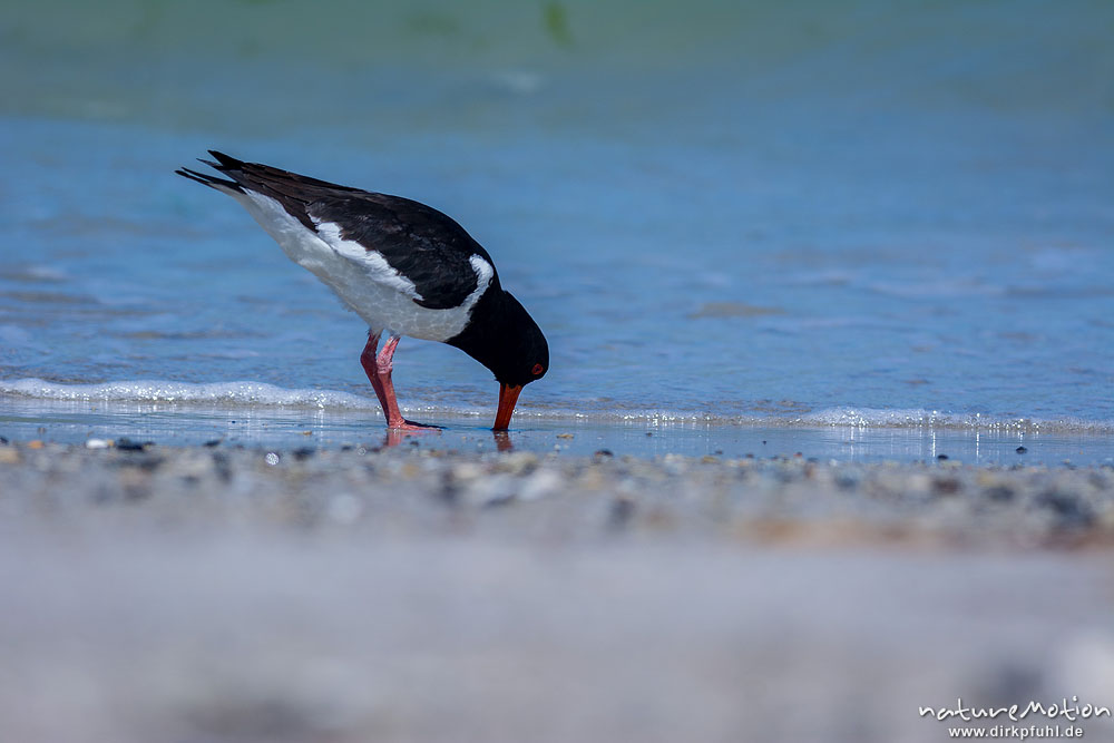 Austernfischer, Haematopus ostralegus, Haematopodidae, Tier läuft am Spülsaum und nimmt Bad in den Wellen, Düne, Nordstrand, Helgoland, Deutschland