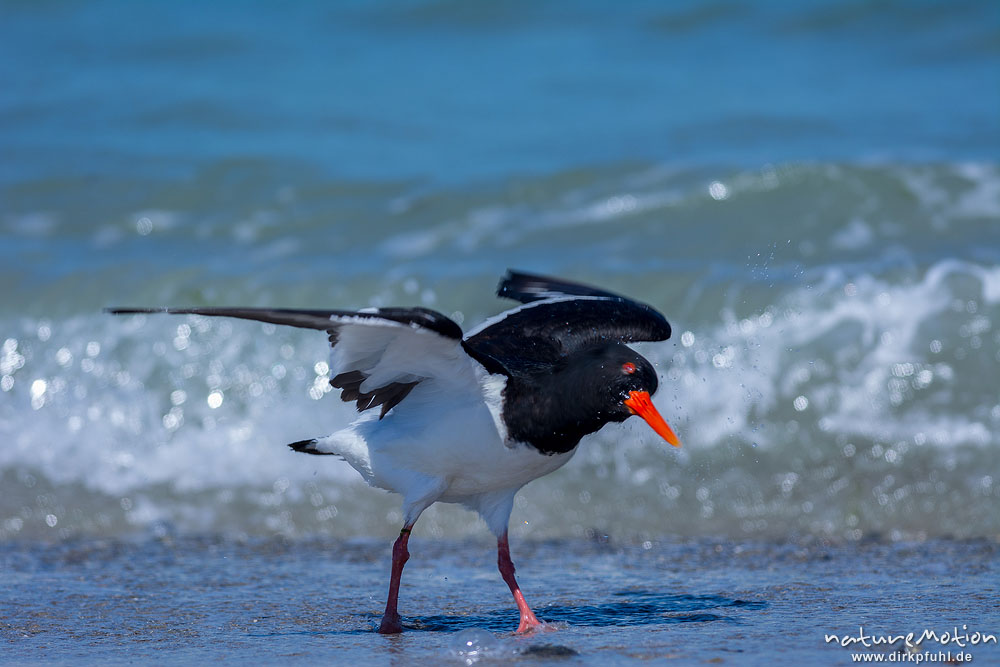Austernfischer, Haematopus ostralegus, Haematopodidae, Tier läuft am Spülsaum und nimmt Bad in den Wellen, Düne, Nordstrand, Helgoland, Deutschland
