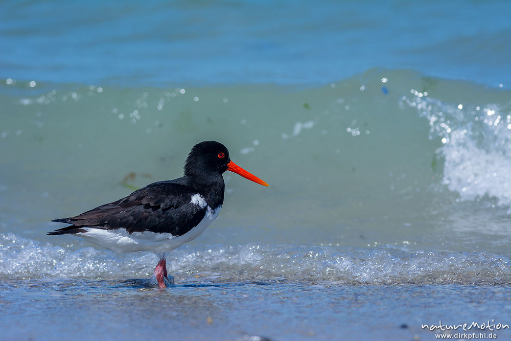 Austernfischer, Haematopus ostralegus, Haematopodidae, Tier läuft am Spülsaum und nimmt Bad in den Wellen, Düne, Nordstrand, Helgoland, Deutschland
