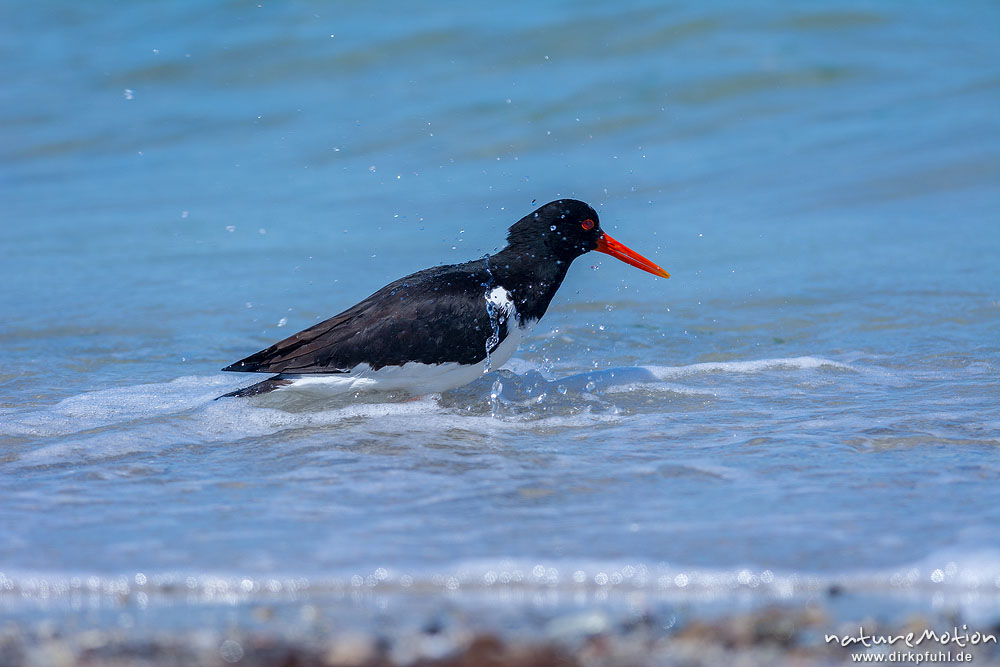 Austernfischer, Haematopus ostralegus, Haematopodidae, Tier läuft am Spülsaum und nimmt Bad in den W, Helgoland, Deutschland