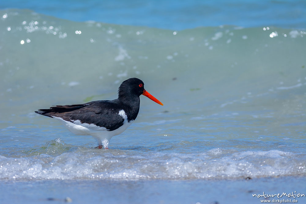 Austernfischer, Haematopus ostralegus, Haematopodidae, Tier läuft am Spülsaum und nimmt Bad in den Wellen, Düne, Nordstrand, Helgoland, Deutschland
