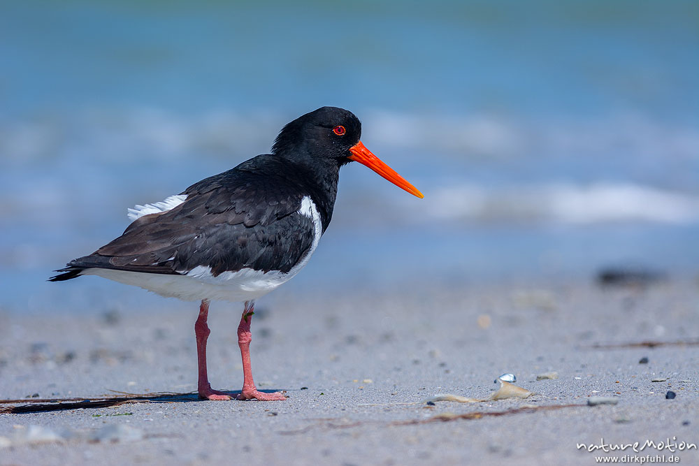 Austernfischer, Haematopus ostralegus, Haematopodidae, Tier läuft am Spülsaum und nimmt Bad in den Wellen, Düne, Nordstrand, Helgoland, Deutschland