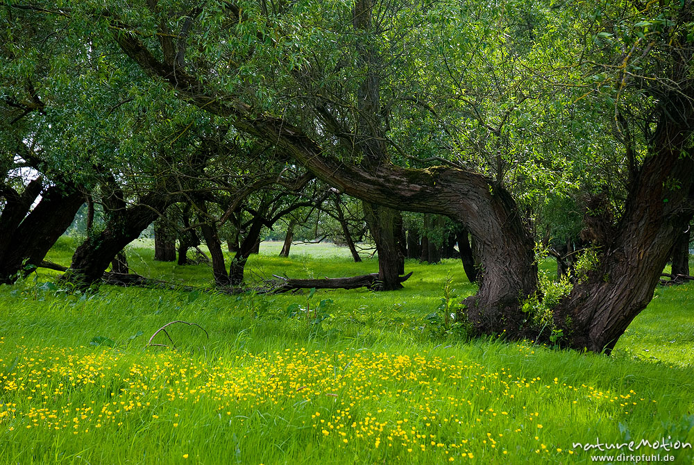 Auwald mit Silber-Weiden und blühendem Hahnenfuß, Elbtalaue, Rühstädt bei Wittenberge, Deutschland