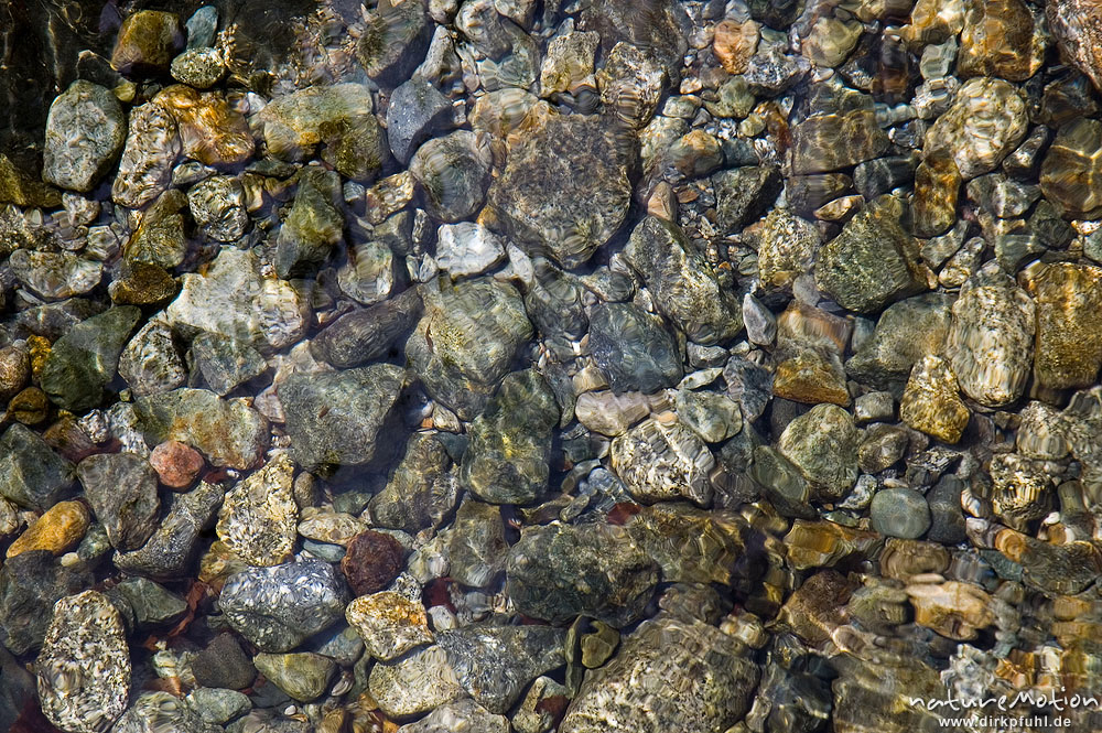 Bachbett mit Kieseln und schillernder Wasseroberfläche, Cascade des Anglais Korsika, Frankreich