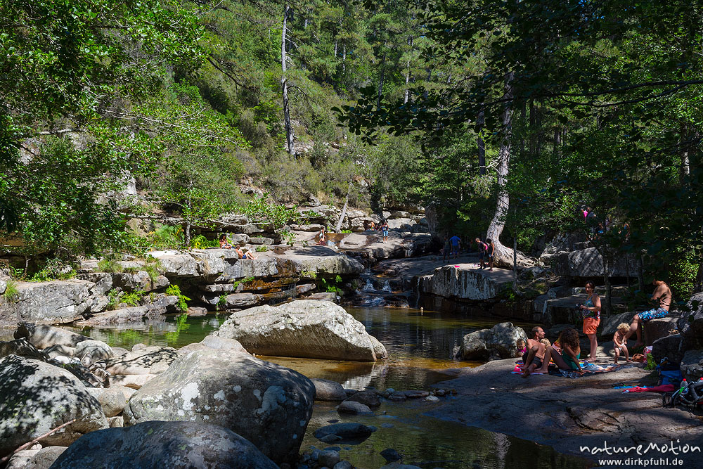 Badegumpen und badende Menschen, Foret D'Aitone, Aitone-Bach bei Evisa, Cascades d'Aitone, Korsika, Frankreich