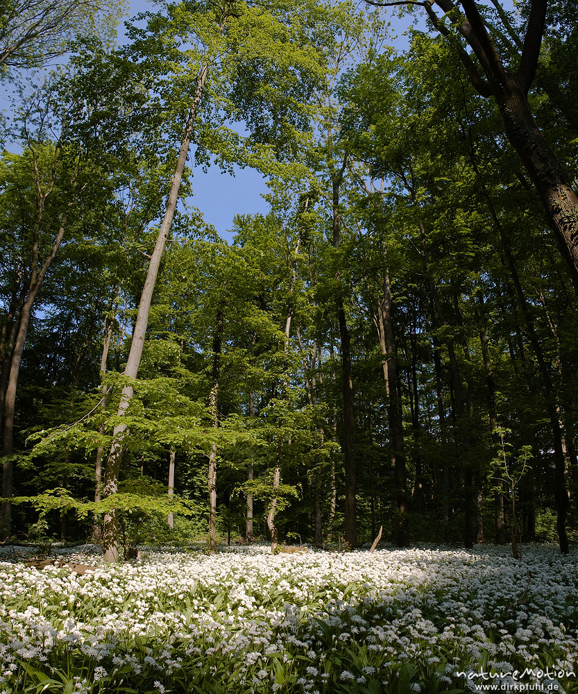 Bärlauch, Allium ursinum, Liliaceae, blühend, dichter bestand auf Lichtung im Buchenwald, Göttingen, Deutschland