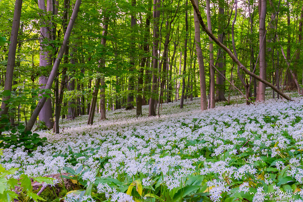 Bärlauch, Allium ursinum, Liliaceae, dichter Bestand blühender Pflanzen im Buchenwald, Westereberg, Göttingen, Deutschland