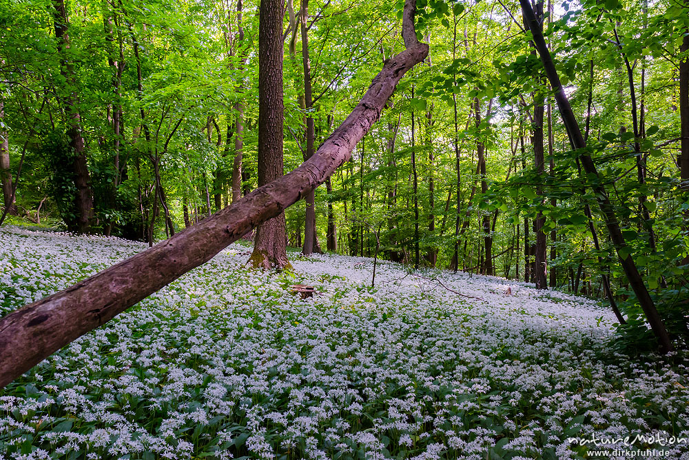 Bärlauch, Allium ursinum, Liliaceae, dichter Bestand blühender Pflanzen im Buchenwald, Westereberg, Göttingen, Deutschland