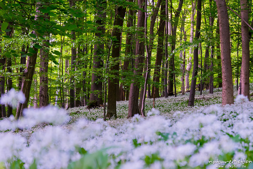Bärlauch, Allium ursinum, Liliaceae, dichter Bestand blühender Pflanzen im Buchenwald, Westereberg, Göttingen, Deutschland