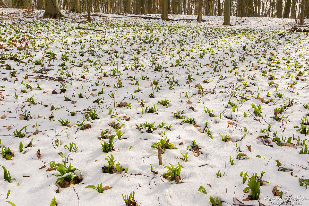 Bärlauch, Allium ursinum, Liliaceae, erste Blätter sprießen aus dem Schnee, Westerberg, Göttingen, Deutschland