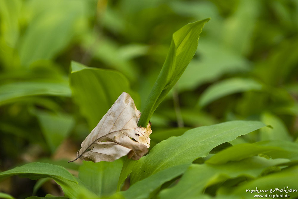 Bärlauch, Allium ursinum, Liliaceae, Laubblätter haben beim wachsen ein trockenes Buchenblatt durchbohrt und aus der Streu emporgehoben, Blatt dadurch an der Spitze noch immer zusammengerollt, Göttinger Wald, A nature document - not arranged nor manipulated, Göttingen, Deutschland