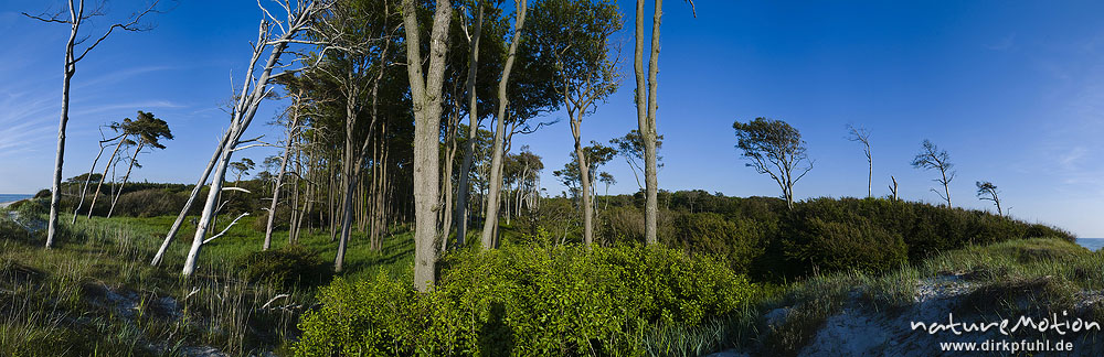 Bäume an der Dünenkante, abgestorbene Stämme oder vom Wind gebeugt, Windflüchter, Darsser Weststrand, Darß, Zingst, Deutschland